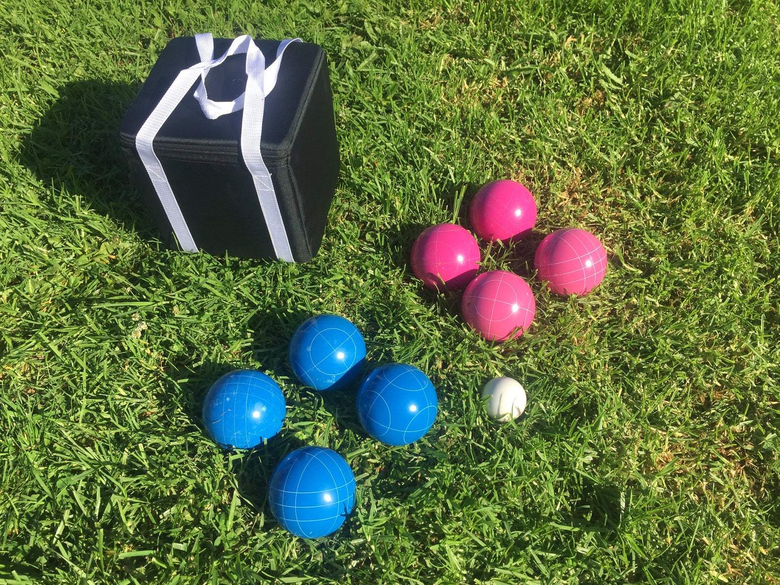 SET INCLUDES - 4 Pink and 4 Blue 107mm balls with two different scoring patterns, 1 white 60mm pallino ball, and a durable black carrying case with white straps