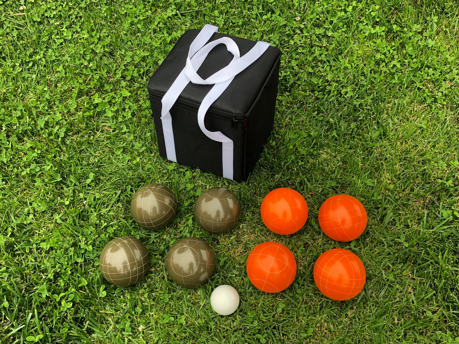 SET INCLUDES - 4 Olive Brown and 4 Orange 107mm balls with two different scoring patterns, 1 white 60mm pallino ball, and a durable black carrying case with white straps