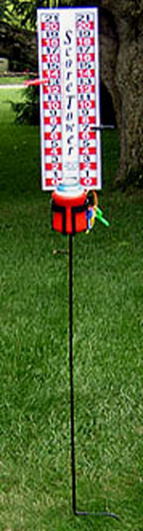 This scoreboard is a double-sided free-standing scorekeeper for Bocce and other outdoor games. It easily pushes into the ground, and brings the score to a convenient height for all players. The step-stake is made from heavy gauge steel with black powder coat paint for endurance. The scoreboard is made from all-weather plastics designed to stand up to outdoor use. A tailgate stand is included for times when the scoreboard needs to be supported on a firmer surface.